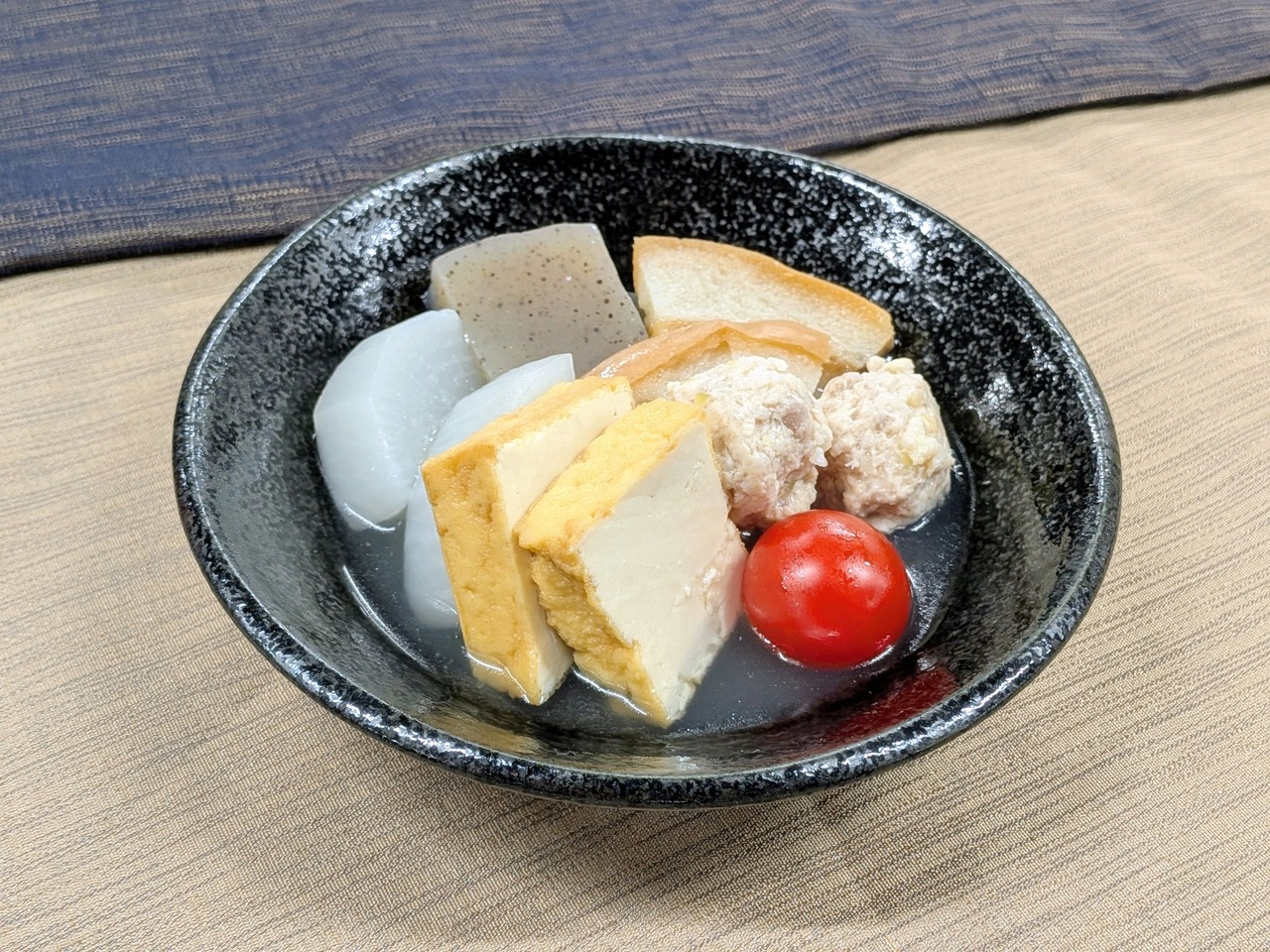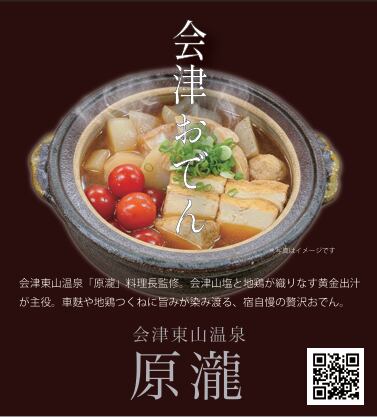 会津東山温泉「原瀧」総料理長監修。会津山塩と会津地鶏が織りなす黄金出汁が主役。会津車麩や会津地鶏つくねに旨みが染み渡る宿オリジナルのおでん。